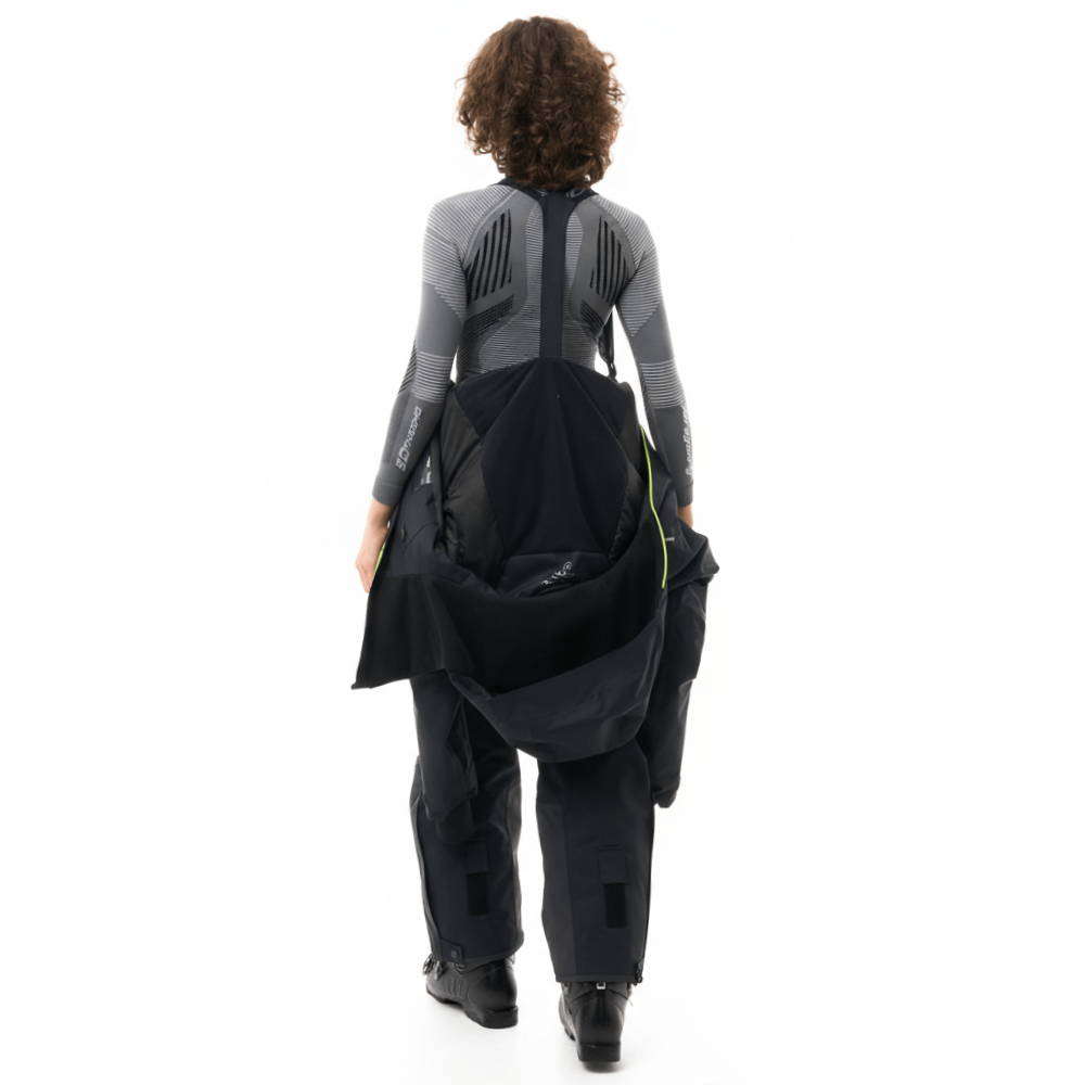 - Поперечная молния в нижней части спины ("бомболюк") позволяет легко и быстро открыть низ, не снимая при этом весь комбинезон. Молния укрыта внешним и внутренним клапаном.