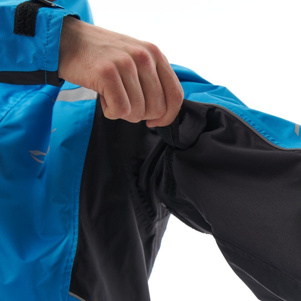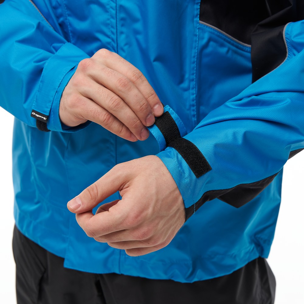 Двойная планка с водоотводящим клапаном и резиновым держателем для комфортного расстегиванияНагрудный карман на молнии, скрытый за планкойСистема утяжки (на предплечьях, запястьях, сзади на талии) для уменьшения парусности и адаптации под индивидуальные параметры