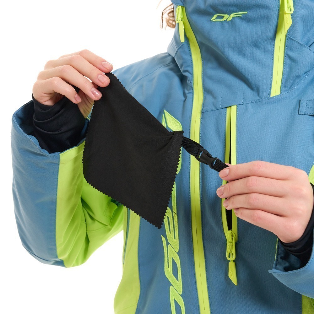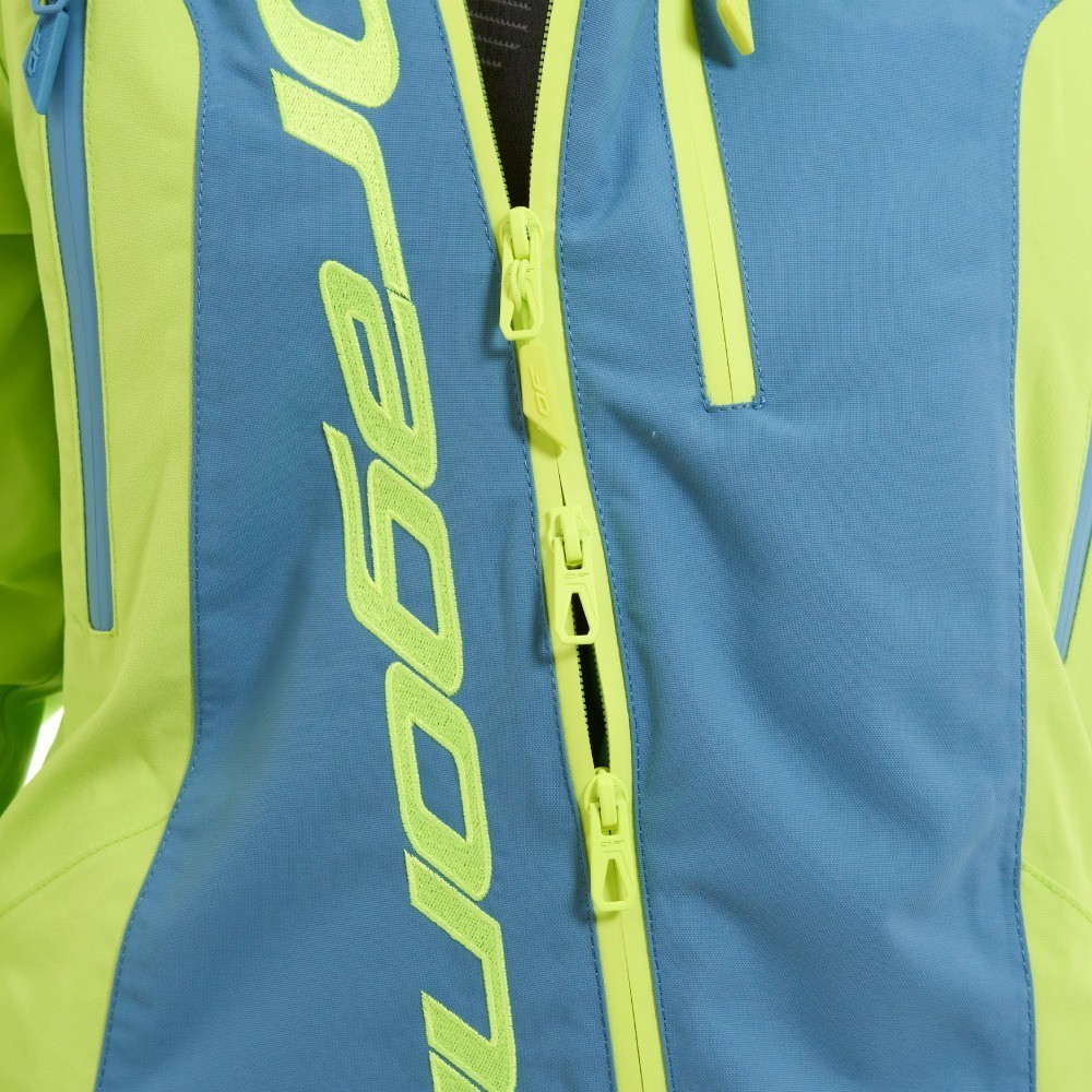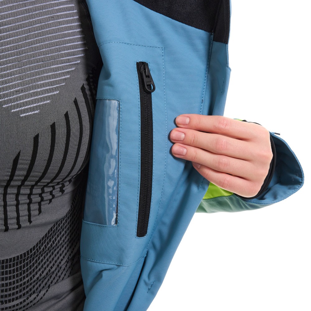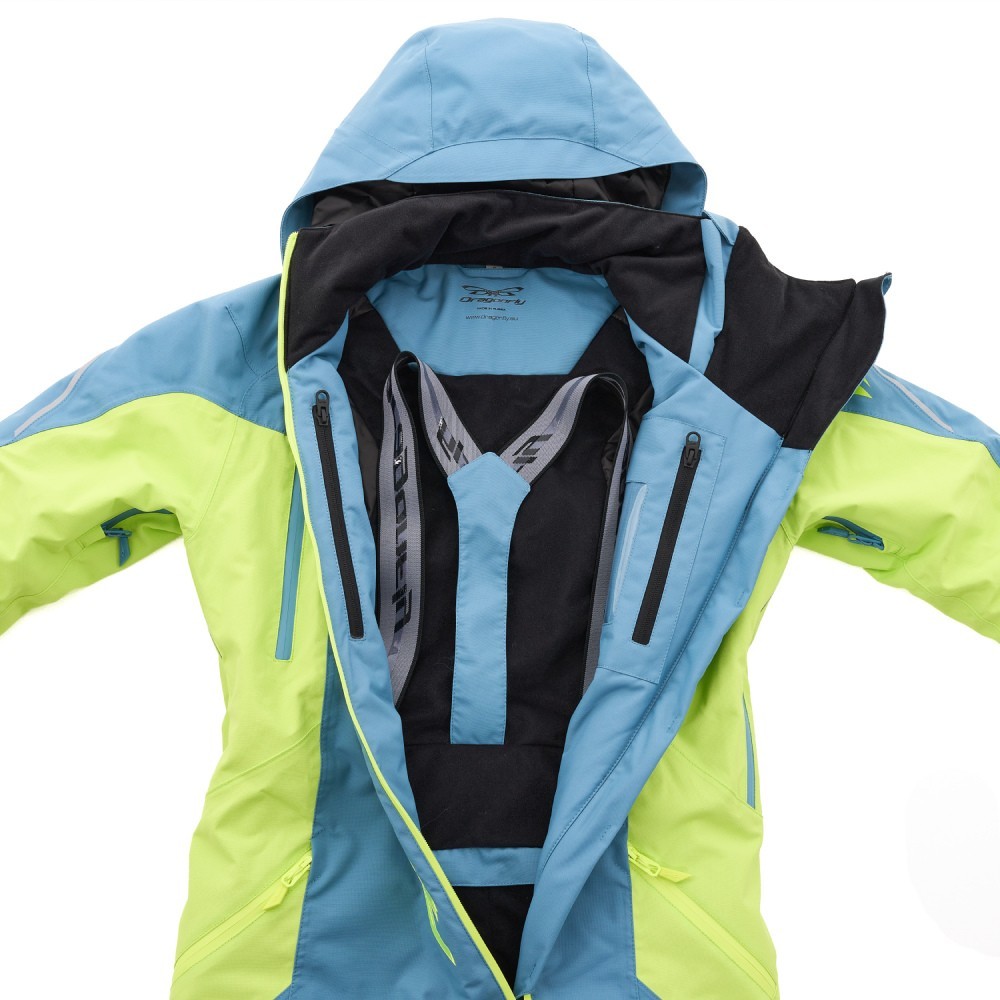 - 6 внешних карманов на влагозащитных молниях (три нагрудных, два на поясе, один для ски-пасс), 2 внутренних кармана на молнии (для телефона с пленкой touch screen и для документов)